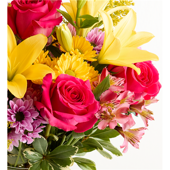 Inspired by the traditional hand-tied arrangements found in flower markets throughout Europe, our best-selling seasonal bouquet gathers a mix of vibrant blooms inside a classic glass vase tied with raffia. It will bring cheerful Old World charm to any springtime celebration.