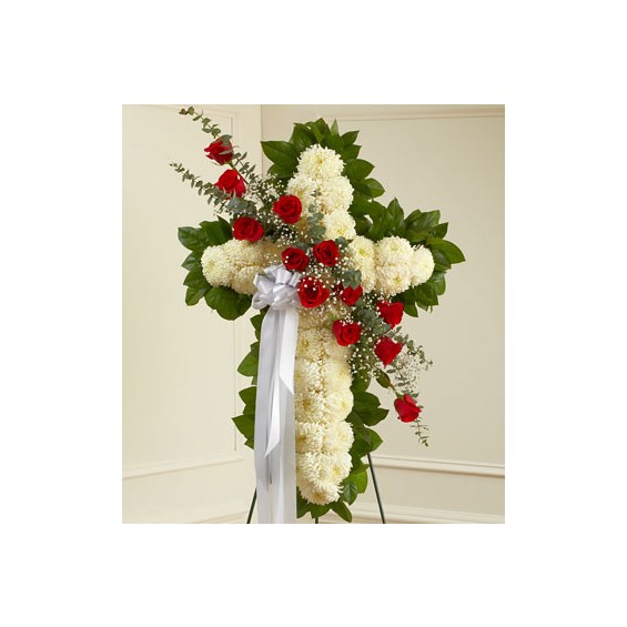 •Standing cross arrangement of white football mums and red roses; accented with soft, lush greenery